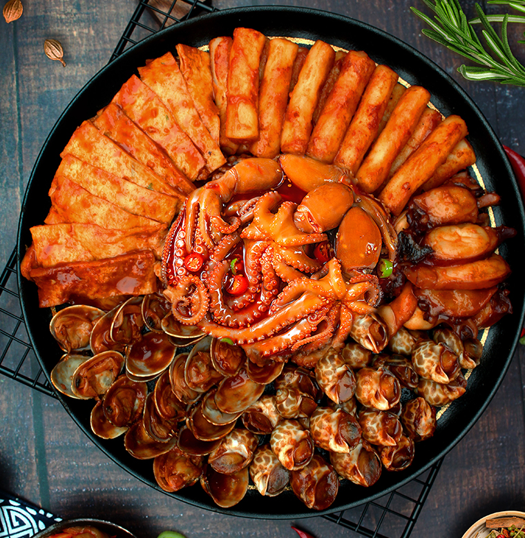 韓式炒年糕(速凍面米食品)、魚餅(速凍肉糜類制品)、韓式甜辣醬(復合調味料)、蛤肉、花螺、魷魚足片、小章魚、蝦